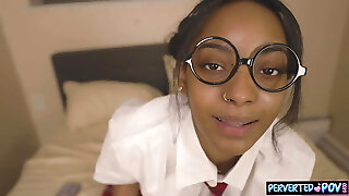 Dark-hued stud wearing glasses fucks shaved slit of sexy ebony teen