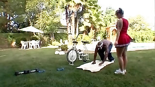 Naughty cheerleader Liza Rowe drops her uniform for a dark-hued spear