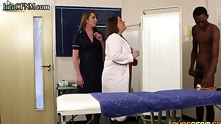 CFNM IR nurses in uniform and heels suck dark-hued cock in 3way