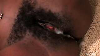 A black beauty in sexy tights loves to get hot jism on her juicy pussy.