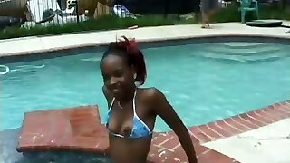 Fantastic ebony slender stunner in the pool shows off her sexy body and eats white guy